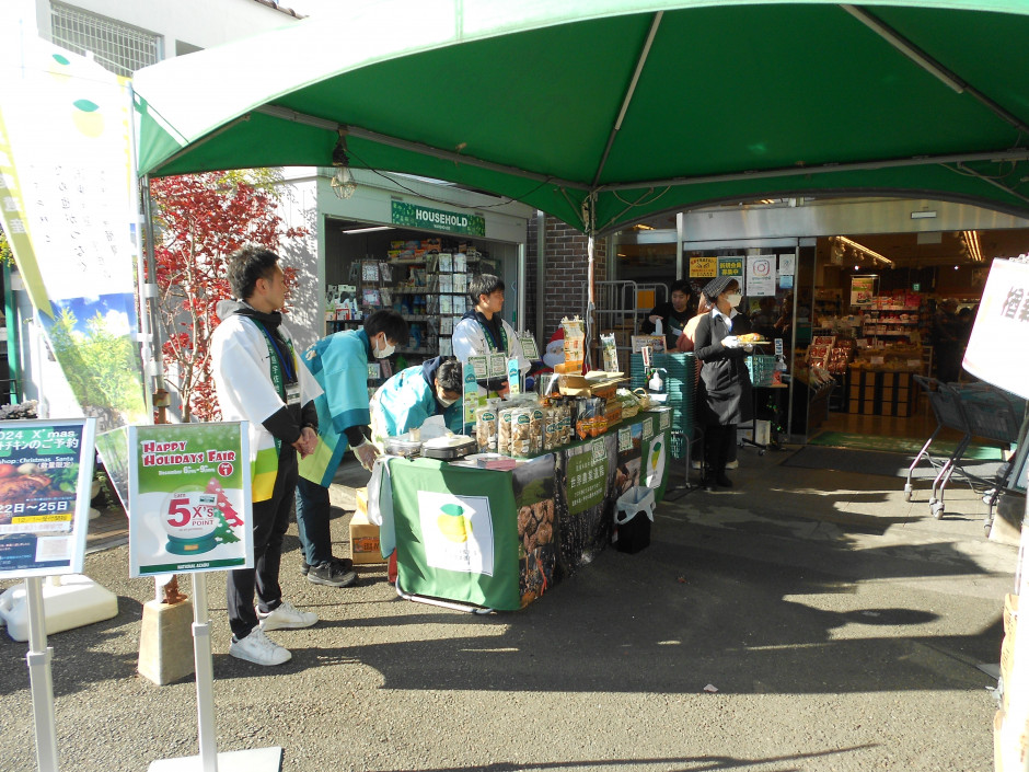 12月7・8日に世田谷区玉川田園調布のナショナル田園にて「温故蜜柑」と「うまみだけ」を中心とした大分県・国東半島宇佐地域産の有機野菜を含む農林産物の宣伝販売を行いました。店定番の「うまみだけ」については県林産振興室の林祐希主査と佐藤匠主任が積極的に試食宣伝しました。