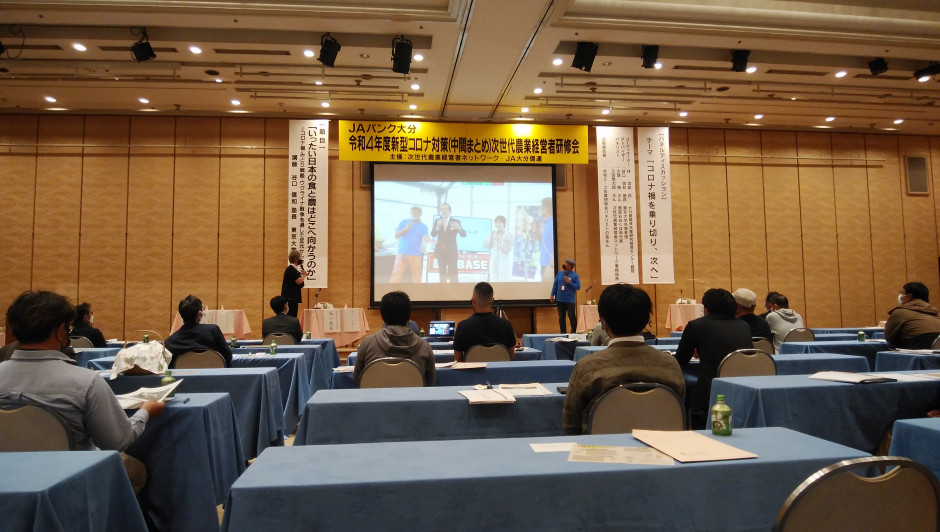 大分県内の若手農業者で組織する次世代農業経営者ネットワークとJA大分信連主催の「コロナ禍を乗り切る」をテーマとした新型コロナ対策中間まとめの農業研修会が4月19日(火)、大分市内トキハ会館にて開催されました(若手農業者・関係者100名参加)。大分県の広瀬勝貞知事が「激変する世界と地域社会の中、若手農業者に農業・農村の牽引を期待する」と激励挨拶、東京大学名誉教授の谷口信和講師による「いったい日本の食と農はどこへ向かうのか~コロナ禍・みどり戦略・ウクライナ戦争を通して足元から考える~」の基調講演と「コロナ禍を乗り切り、次へ」をテーマにパネルディスカッションが行われた。コロナ禍の終息の見通しが立たない中、ウクライナ戦争の勃発で、農業・農村を取り巻く環境は厳しくなるばかり、「持続可能な農業」には地域資源のフル活用や生産者と消費者の相互理解などが必要と白熱した議論が展開。具体的な活動も提案された。