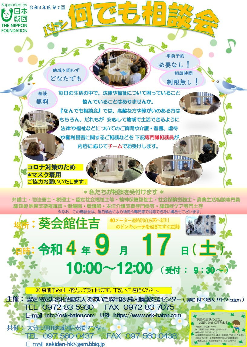 9月17日(土)10時~12時まで、大分葵会館住吉で開催の第7回バトン何でも相談会のチラシができましたのでお知らせします。