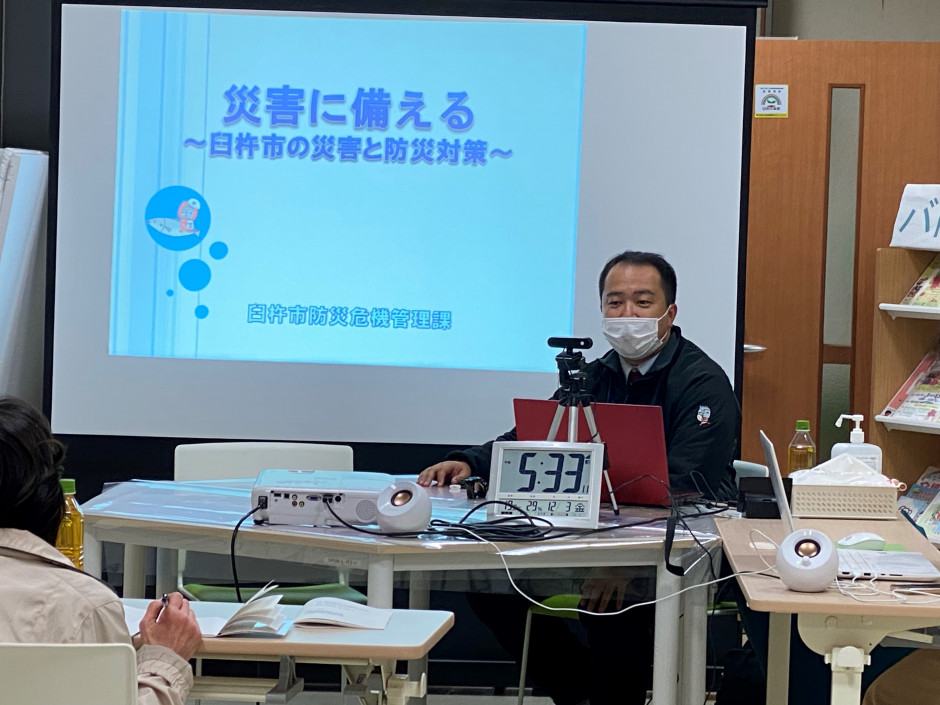 ㊸『防災について』と題して、臼杵市防災危機管理室主査 今宮佳祐さんから臼杵市の現状と地震の予測、備えや取組み、情報伝達手段等をわかりやすく教えていただきました。