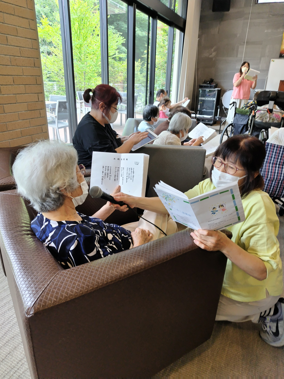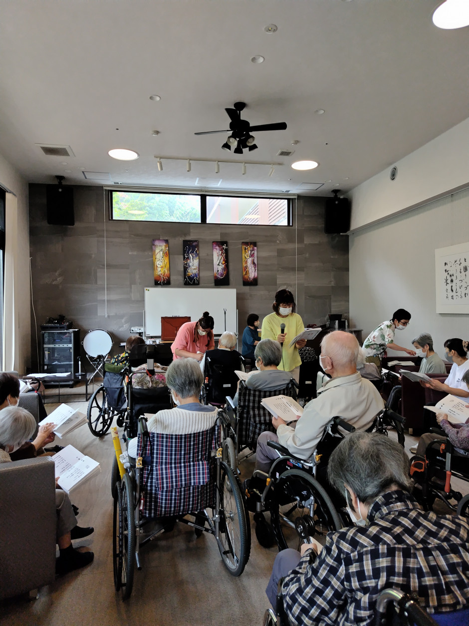 この施設は今回で4回目の訪問です。顔なじみの利用者さんもいらっしゃいます。皆さんと紙芝居や昔懐かしい曲を大きな声で歌い、楽しい時間を過ごしました、。