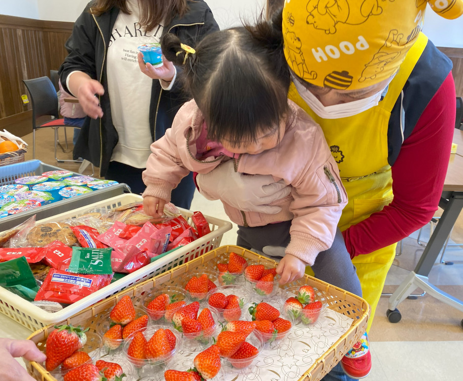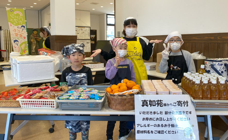 お野菜たっぷり、愛情たっぷりの手作り和牛すじカレーとヨーグルト、伊藤園のお茶、真如苑さんからお豆や丸ボーロを、一般社団法人篠原欣子記念財団様から頂いた寄付金で、ミカンといちごを購入して提供しました。
