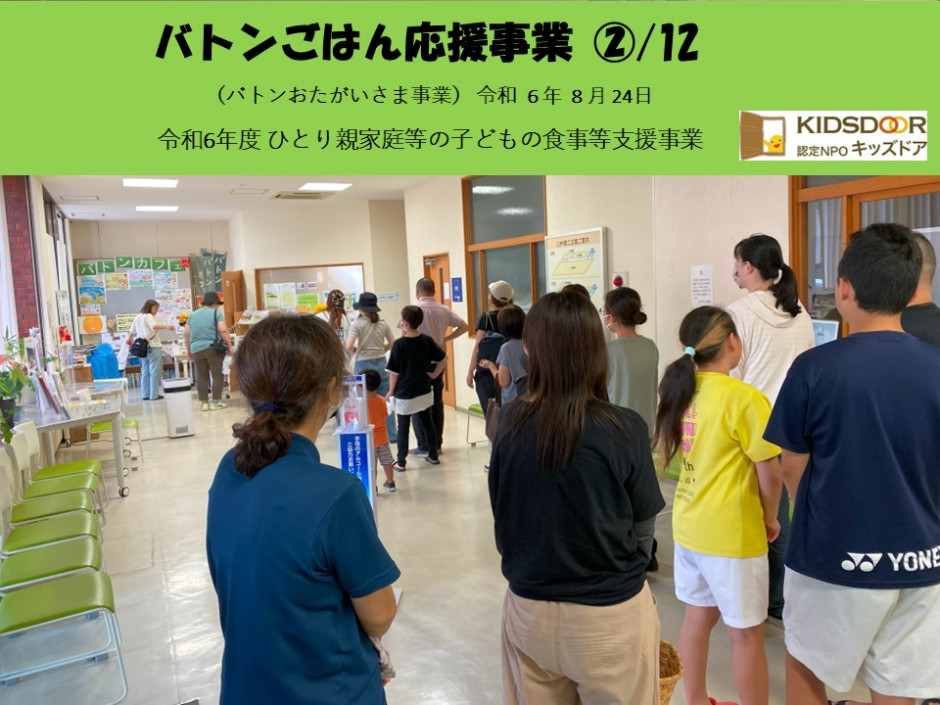 8月24日(土)17時~バトンごはん応援事業(おたがいさま事業)②/12(令和6年度ひとり親家庭等の子どもの食事等支援事業〈キッズドア〉)で、ひとり親・多きょうだい等のご家庭へ、お弁当350個(佐伯市(臼杵市内勤務)、津久見市、臼杵市、大分市在住の方へ)をご提供しました。