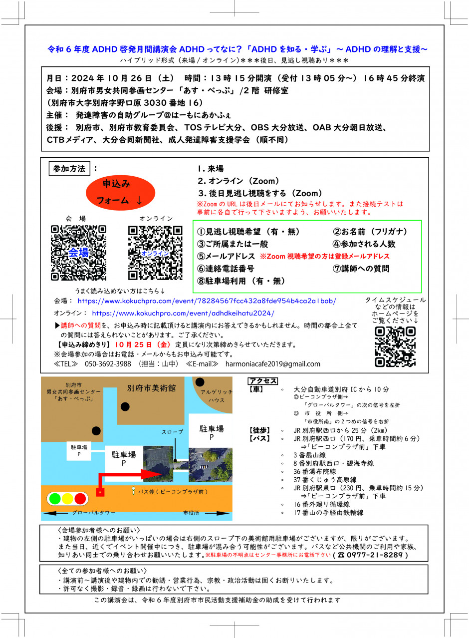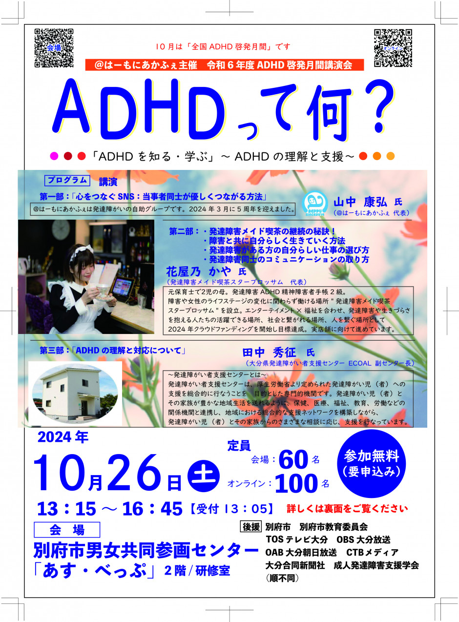 【オンライン/大分県別府市】ADHD啓発月間講演会 ADHDって何?「ADHDを知る・学ぶ」~ADHDの理解と支援~