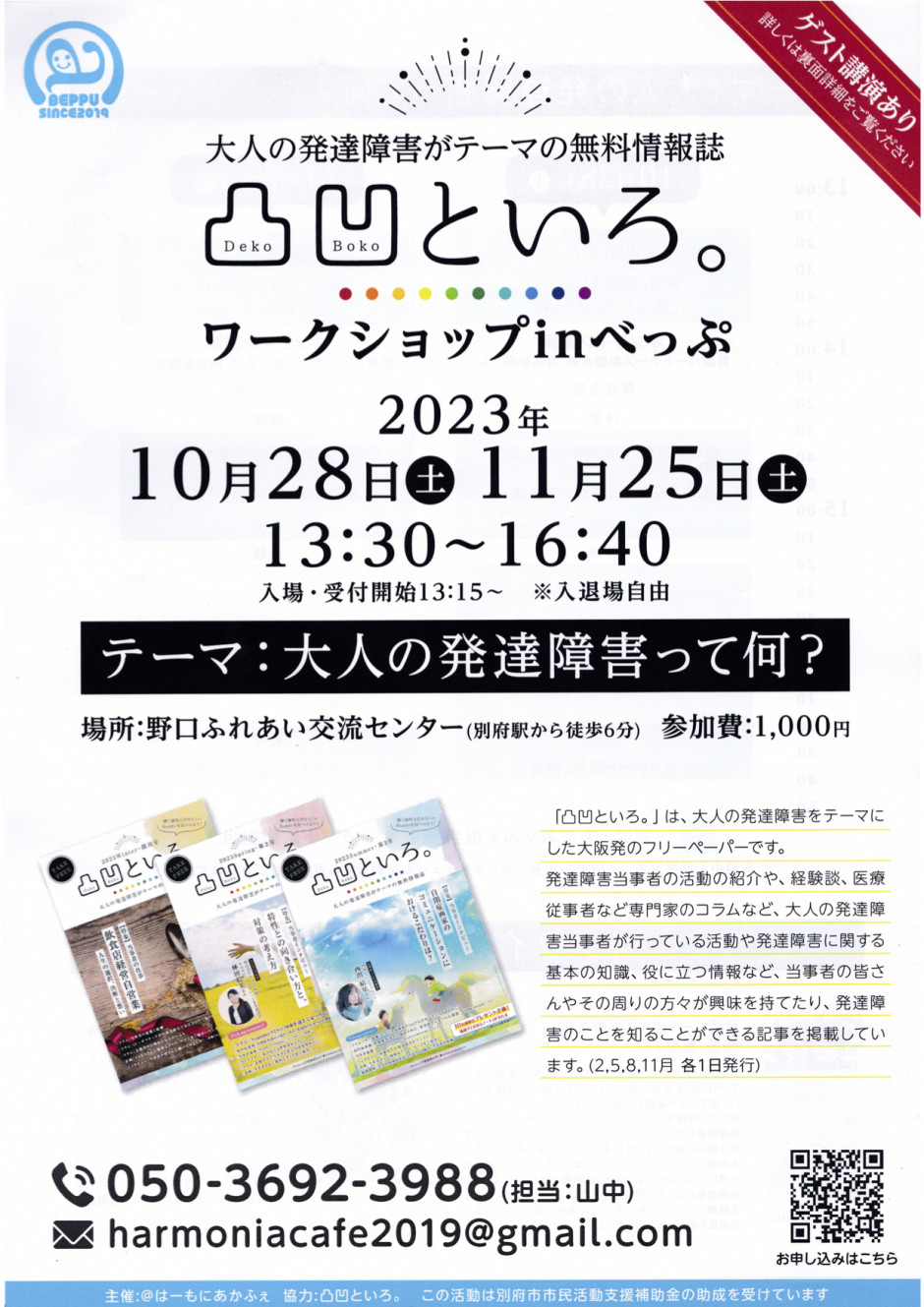 令和5年度別府市市民活動支援補助金を受けまして、より内容の濃いワークショップにより、「大人の発達障害」の周知を行うべく、昨年2月から発行されました大人の発達障害がテーマのフリーペーパー「凸凹といろ。」さんのご協力を得ることができました。