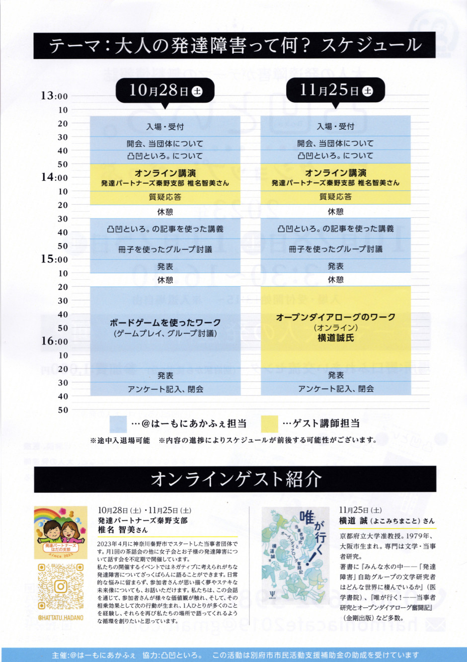 周囲で支援する人達のための団体である、大分県別府市を主に活動をしている任意団体『@はーもにあかふぇ』が、「大人の発達障害」の周知を目的としたワークショップを大阪府下だけでなく全国展開で動かれている「大人の発達障害」がテーマのフリーペーパーである『凸凹といろ。』を使ったワークショップを開催します。ワークショップではそのフリーペーパーを使ったグループ討議や当事者・研究の第一人者によるゲスト講演や療育や脳トレにも使われるようなボードゲームによるワークをします。「大人の発達障害って何?」を知りたい人はどなたでも対象です。