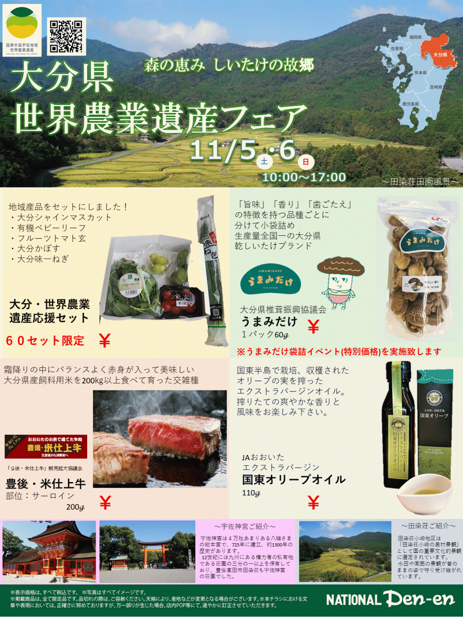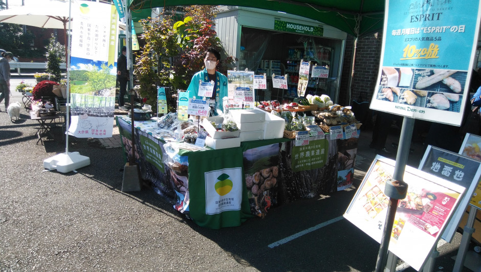 世界農業遺産ブランド推進事業を活用して大分県内の世界農業遺産認定・応援商品を扱う関係有志が世田谷区玉川田園調布の地域密着型スーパー「ナショナル田園」で11月5・6日にフェアを開催しました。今回は、大分県乾しいたけ「うまみだけ」並びに「有機ベビーリーフ」「フルーツトマト玄」「大分かぼす」「大分味一ねぎ」「大分シャインマスカット」を詰め合わせた「大分世界農業遺産応援セット」を前面に打ち出し宣伝販売を行いました。当該スーパーでは地域住民の応援もあり、周年5品目、季節限定5品目の大分県産農林産物が定着、販売されるようになっています。