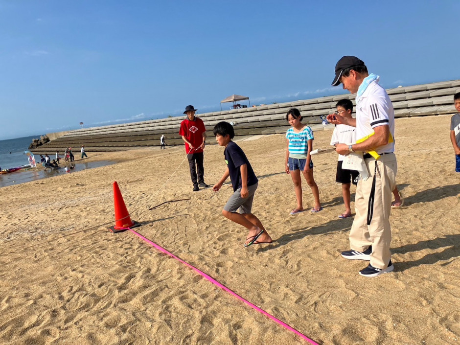 海辺でできるレクリエーションとして、①ビーさん飛ばし選手権②海に関する○×クイズ③カヌー体験④海浜清掃をさせていただき、海に関する知識や安全、海にゴミについての啓発運動も含めたイベントでした。また、ビーさん飛ばし選手権や海に関する○×クイズでは、豪華賞品(熱中症対策グッズ)もあり大盛り上がりでした。日頃なかなかできないカヌー体験は大変好評で、子どもから大人まで多くの方が体験してくださいました。