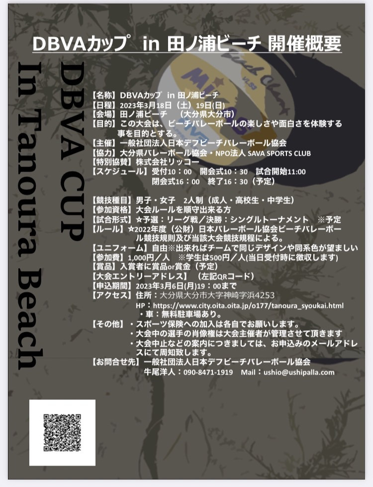 【お問合せ先】一般社団法人日本デフビーチバレーボール協会 牛尾洋人:090-8471-1919 Mail:ushio@ushipalla.com