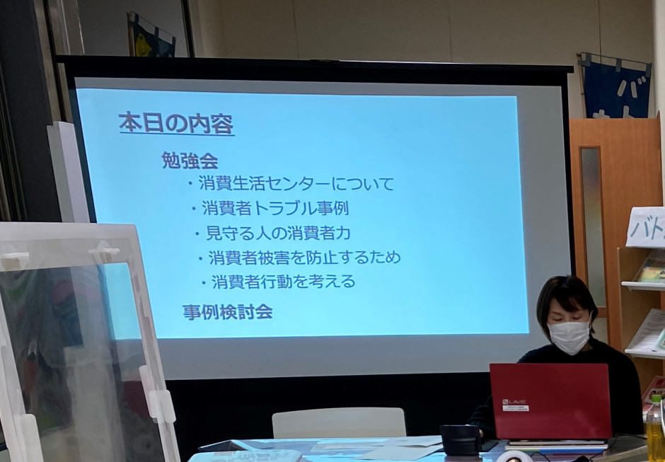 1月27日18時から感染防止対策のもと、令和3年度第10回バトン勉強会と事例検討会を開催しました。『見守る人の消費者の知識が必要になる』と題して、消費者相談専門員の姫野るみさんからご教示いただきました。消費者問題に長年取り組まれた知識や経験、また最新の手口や対応方法について、詳しく教えて下さり、事例の紹介などもあり、大変学びの深い講義でした。県外からも参加者があり、「特に支援者としては、必ず必要な知識だと改めで感じ入りました。参加して良かった。わが市の消費生活センターの相談専門員と日頃から、連携を取っておくことも必要だと思いました。」等、アンケートに書かれていました。次回、第11回は、2月9日(水)18時~『人としての尊厳を守るためには』と題して、弁護士 徳田康之さんから権利擁護についてお話していただきます。徳田弁護士のお話は何度聞いても感動します。今回も素晴らしい内容です。皆様のご参加お待ちしています。