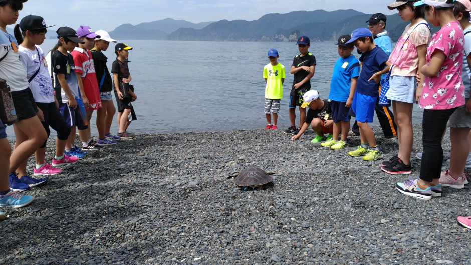 令和元年5月、佐伯市教育委員会と協働で1泊2日のエコツアーを開催しました。宇目緑豊小学校5・6年生と保護者、引率者を含めて25名程度の参加があり、海の遊び体験、施設の展示ミュージアムでの学習会、鶴御崎の史跡や資料館の見学などを行いました。令和2年3月には、前日に開催された九州ウミガメ連絡会と連動してモニターツアーを行い29名が参加しました。