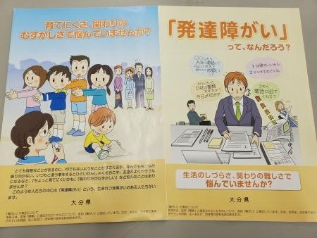 (写真:発達障がいに関するパンフレット子ども編、成人編)