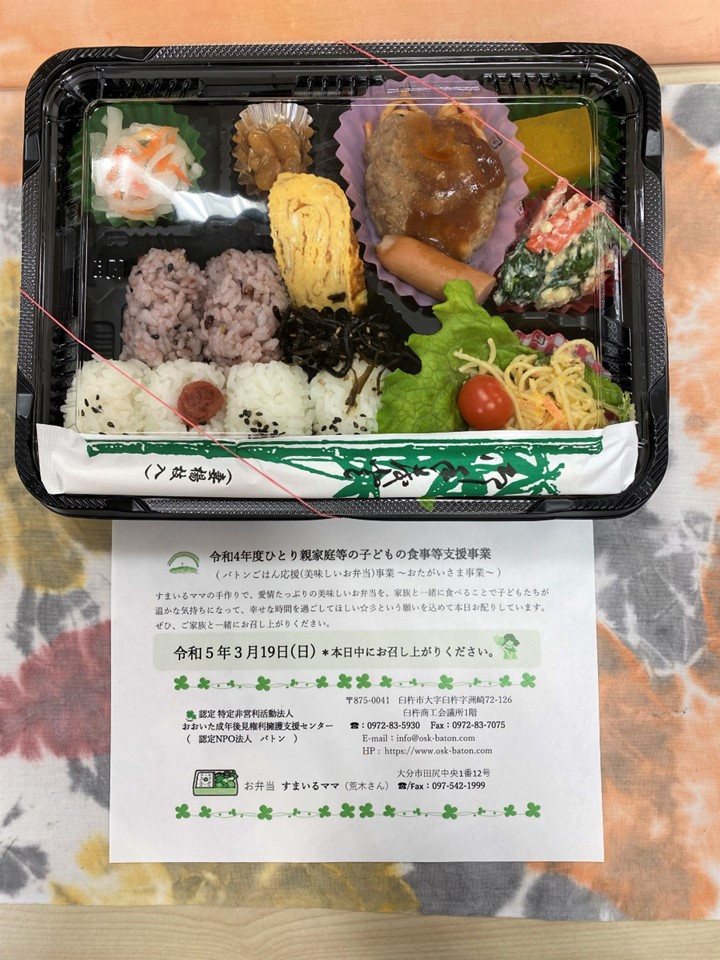 令和4年度ひとり親家庭等の子どもの食事等支援事業(バトンごはん応援(美味しいお弁当)事業~おたがいさま事業)を、3月18日~26日までの土日祭日の計5日間にかけて、650個の手作りで愛情たっぷり、美味しいお弁当と文房具をセットにしてお配りしています。