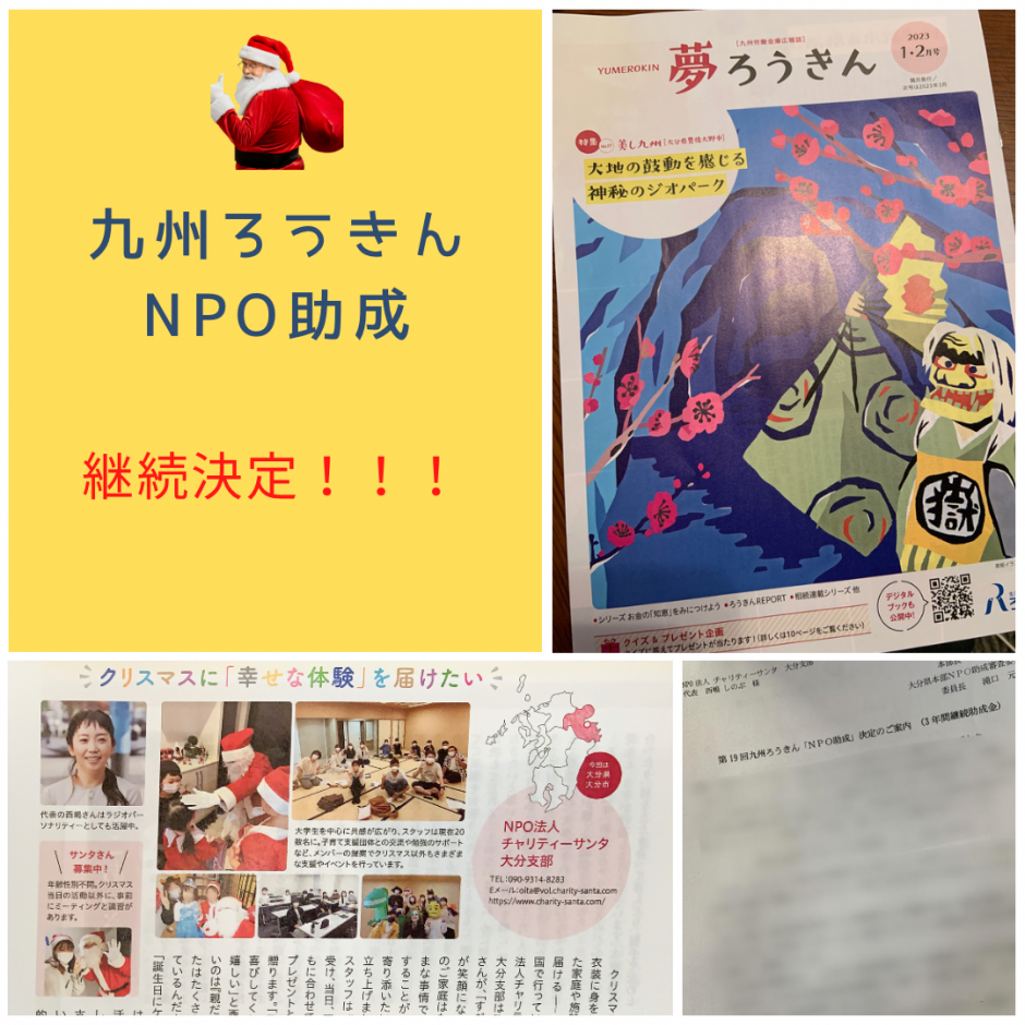 NPO法人チャリティーサンタ大分支部は、2020年から九州ろうきん様から3年間の継続助成を受けて活動させていただいています。