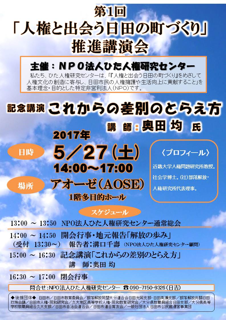 【参加者募集】5/27 第1回「人権と出会う日田の町づくり」推進講演会(NPO法人ひた人権研究センター)