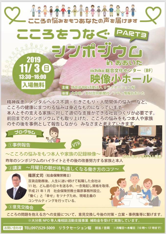 【参加者募集】11/3「こころをつなぐシンポジウム in おおいた」を開催します!(NPO法人リラクセーション桜)
