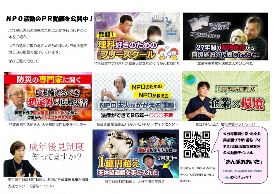 動画はアイネス県民活動支援室の公式動画チャンネル「おんぽおおいた」で公開しておりますので、ぜひご覧ください。