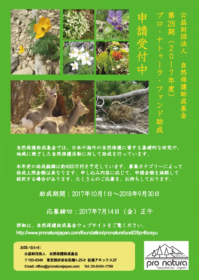 公益財団法人自然保護助成基金から、第28期プロ・ナトゥーラ・ファンド助成募集案内です。