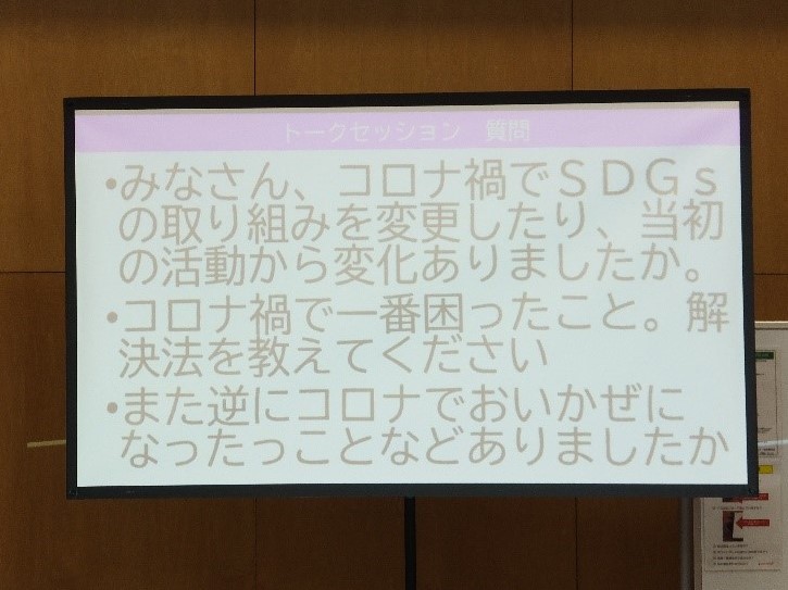 麻袋を再利用した商品開発やクラウドファンディングなどによる発展途上国への教育支援について、コロナ禍での活動をSDGsと紐づけながらご紹介いただきました。 |