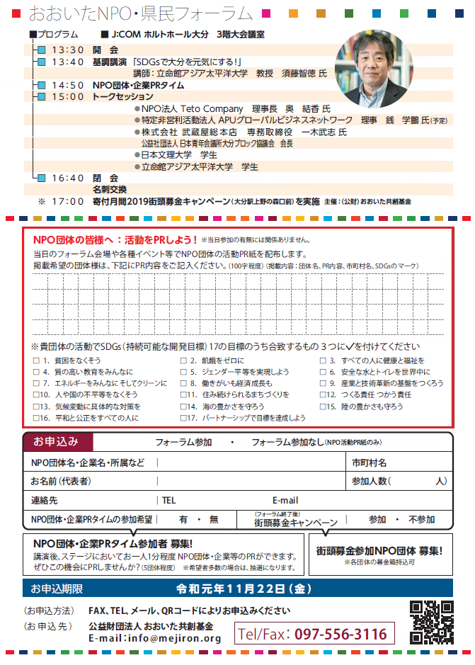 令和元年12月10日に開催される『おおいたNPO・県民フォーラム』で、NPOの活動PR紙を配布します。