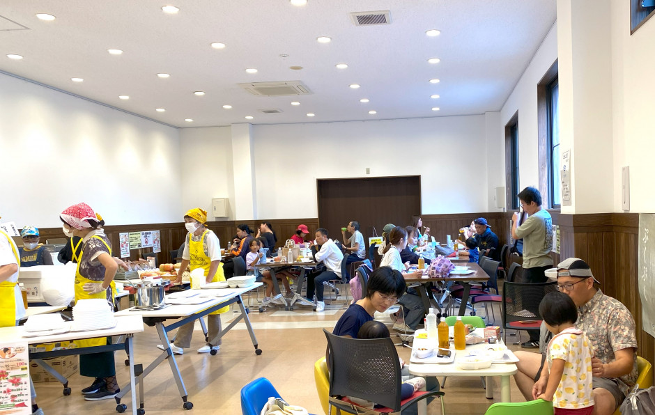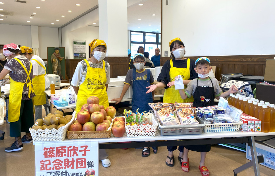 11時30分からお野菜たっぷり、愛情たっぷりの手作り和牛すじカレーとお菓子やゼリー、ジュース、ヨーグルト、お茶とお水等、篠原欣子記念財団様からご寄付いただいたリンゴとキウイを提供しました。