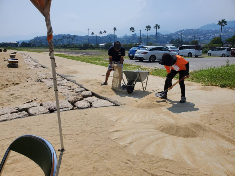 9月7日にビーチバレーボール練習をおこないました。暑さも落ち着いてきて皆楽しそうに練習していました。台風で舞い上がった砂をもとに戻す作業も行いました。
