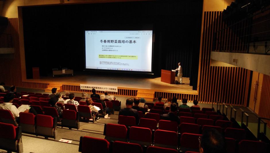 9月3日(火)に豊後大野市清川町の豊後大野市神楽会館多目的ホールで県内生産者と指導者等を対象に大分県農林水産物直売所ネットワーク主催で開催されました。安心・安全で美味しい野菜づくりのポイントを黒木雄二講師(大分県西部振興局所属)が説明、台風10号災害の影響で予定参加者半数の40名が受講されました。