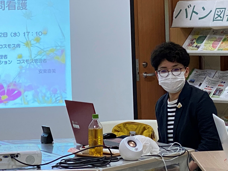 ほぼ在宅・退院支援・)や訪問看護ステーションの役割などを教えていただきました。会場参加の受講者は、訪問看護で365日・24時間対応してくれることを知らなかった、知れて良かった親戚に教えてあげようなどの言葉が聞かれました。私たち専門職の当たり前が、一般の方に届いていない,