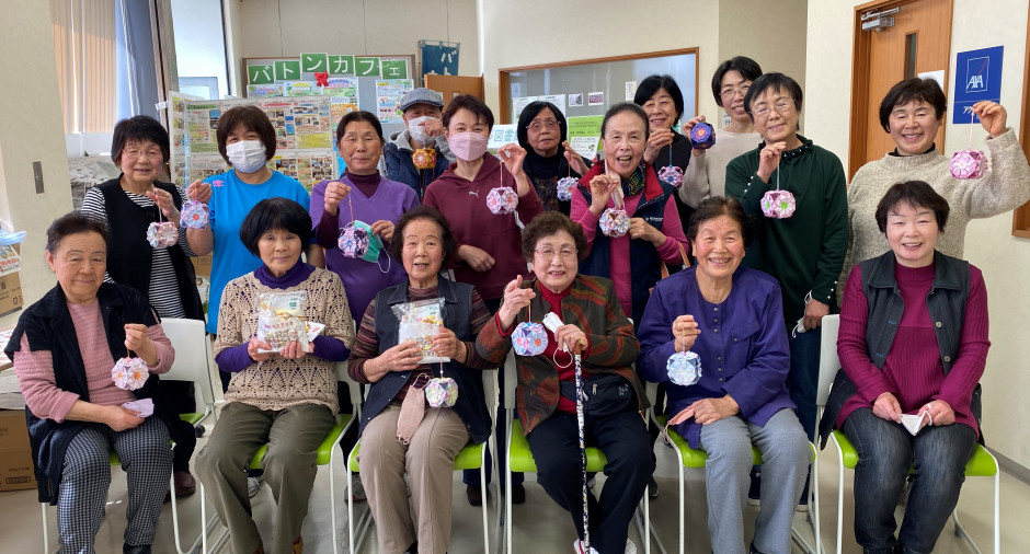 3月のお誕生日の方、4人のお祝いをして、本日作成した「花くす玉」を持って、写真希望の方皆さんで撮影しました。