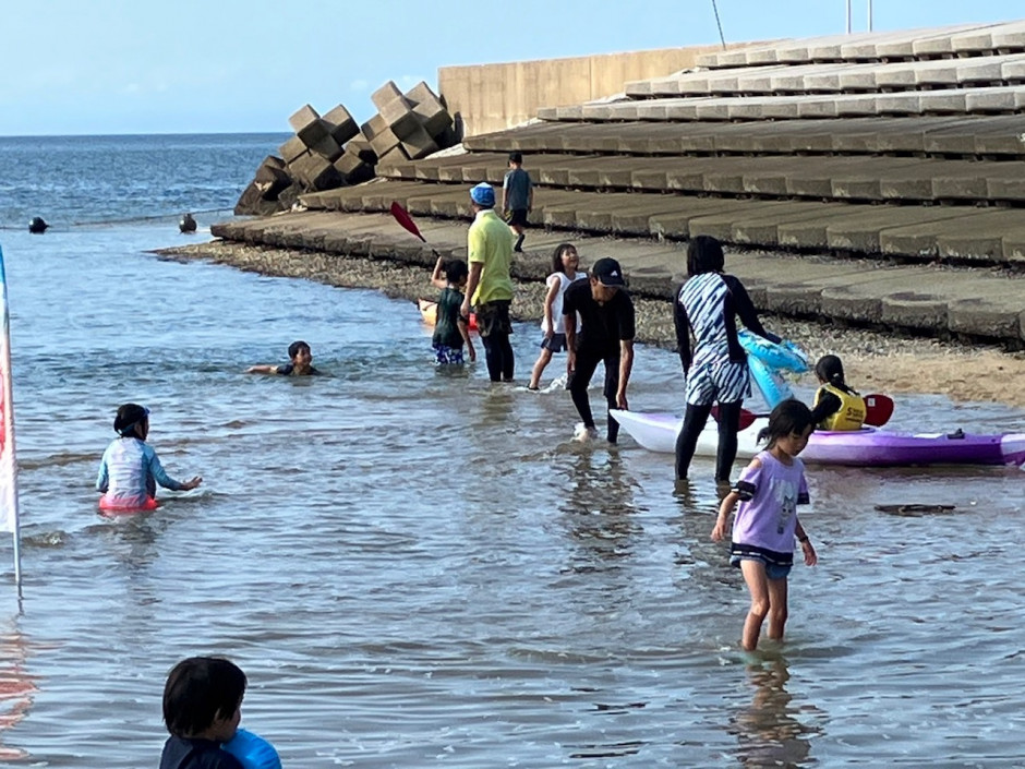 海辺でできるレクリエーションとして、①ビーさん飛ばし選手権②海に関する○×クイズ③カヌー体験④海浜清掃をさせていただき、海に関する知識や安全、海にゴミについての啓発運動も含めたイベントでした。また、ビーさん飛ばし選手権や海に関する○×クイズでは、豪華賞品(熱中症対策グッズ)もあり大盛り上がりでした。日頃なかなかできないカヌー体験は大変好評で、子どもから大人まで多くの方が体験してくださいました。