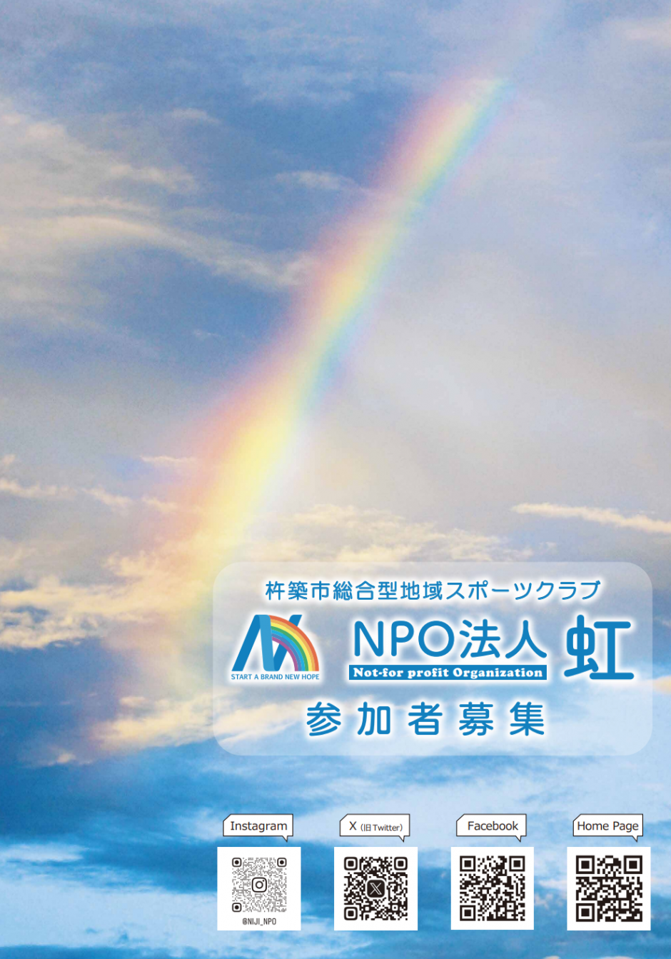 NPO法人虹は、地域住民に対して、スポーツ・文化活動に親しむことができる環境を整え、地域の宝である子どもたちの生涯スポーツへの基盤形成や地域住民の心身の健康の保持増進、それぞれの目的に合わせた継続的なスポーツ・文化活動を提供すること。これらの活動を通して、青少年の健全育成、地域住民相互の親睦、地域コミュニティの推進及び新しい地域社会の実現に寄与することを目的に活動しています。