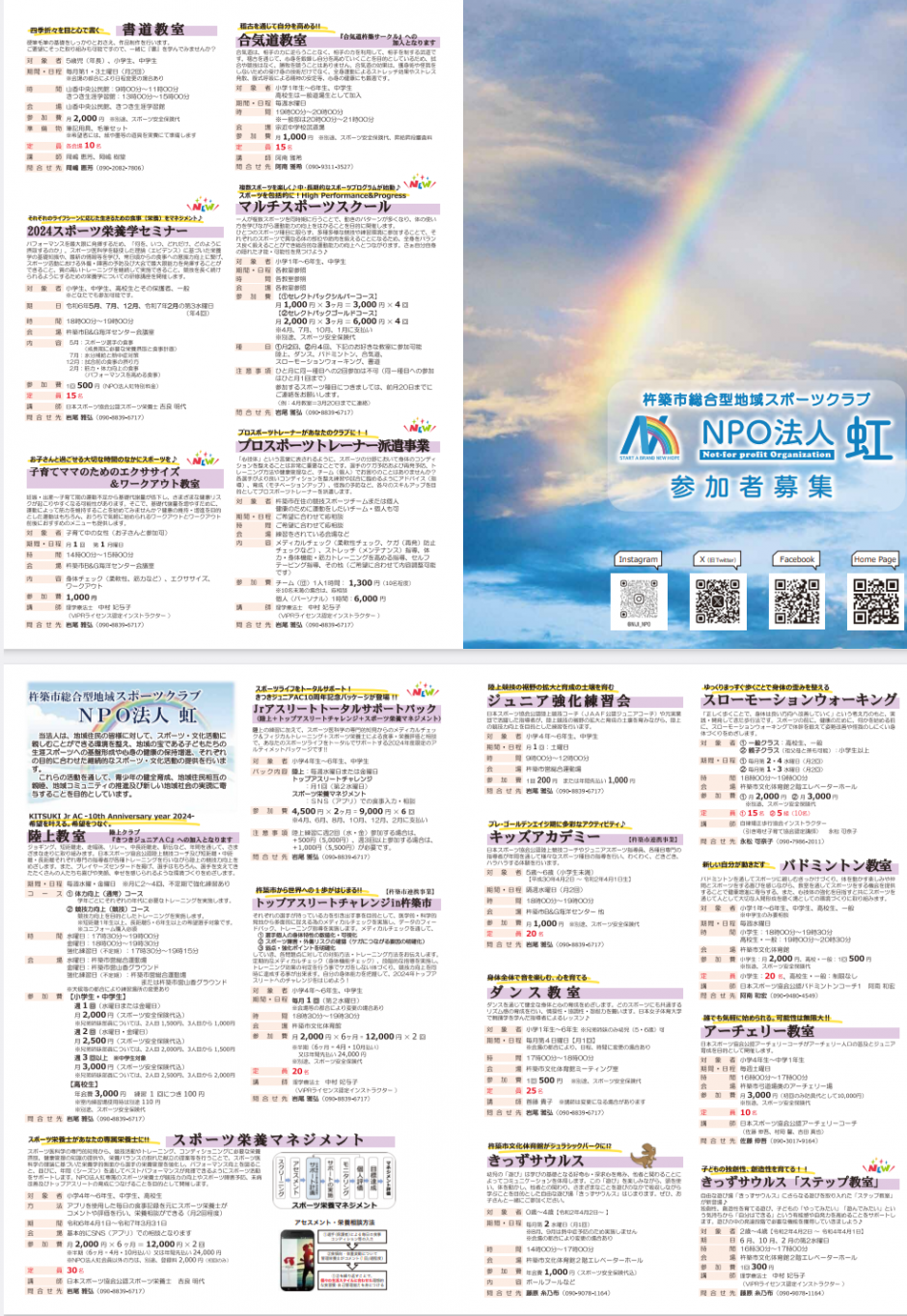 令和6年度(2024年度)は、陸上・キッズアカデミー・きっずサウルス・トップアスリートチャレンジ・スポーツ栄養マネジメント・アーチェリー・バドミントン・合気道・ダンス・スローモーションウォーキング・大人のランニング教室・書道の既存教室に加えて、下記の新しい教室が始まります!!